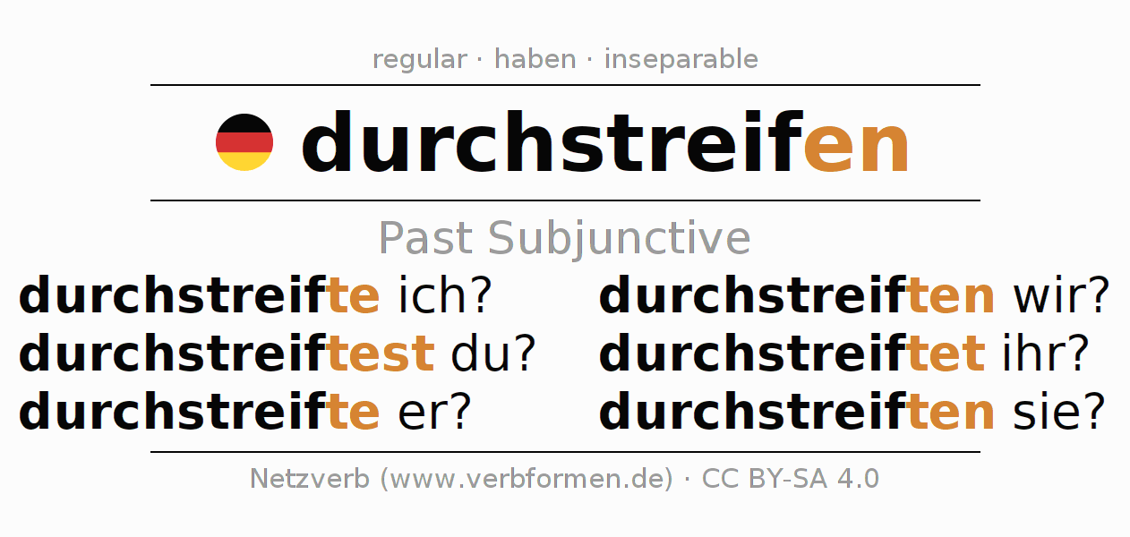 The conjugation of durchstreifen in Subjunctive Imperfect Form of possibility Active is durchstreifte ich?, durchstreiftest du?, durchstreifte er?, durchstreiften wir?, durchstreiftet ihr?, durchstreiften sie?.The conjugation corresponds to certain grammatical rules. Likewise the requirements for the conjugation of the simple verb forms of durchstreifen in Imperfect Subjunctive. Comments ☆