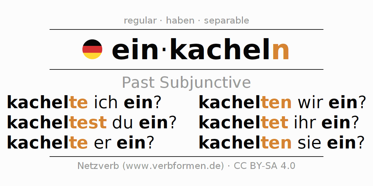 The conjugation of einkacheln in Subjunctive Imperfect Form of possibility Active is kachelte ich ein?, kacheltest du ein?, kachelte er ein?, kachelten wir ein?, kacheltet ihr ein?, kachelten sie ein?.The conjugation corresponds to certain grammatical rules. Likewise the requirements for the conjugation of the simple verb forms of einkacheln in Imperfect Subjunctive. Comments ☆