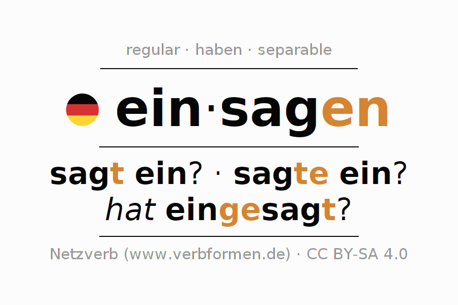 The conjugation of einsagen in Subjunctive Imperfect Form of possibility Active is sagte ich ein?, sagtest du ein?, sagte er ein?, sagten wir ein?, sagtet ihr ein?, sagten sie ein?.The conjugation corresponds to certain grammatical rules. Likewise the requirements for the conjugation of the simple verb forms of einsagen in Imperfect Subjunctive. Comments ☆