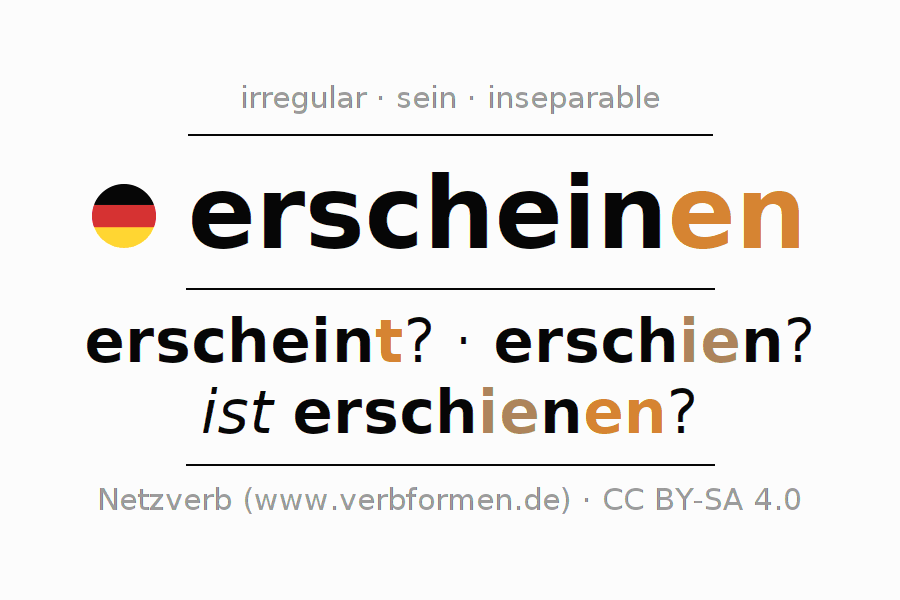 The conjugation of erscheinen in Subjunctive Imperfect Form of possibility Active is erschiene ich?, erschienest du?, erschiene er?, erschienen wir?, erschienet ihr?, erschienen sie?.The conjugation corresponds to certain grammatical rules. Likewise the requirements for the conjugation of the simple verb forms of erscheinen in Imperfect Subjunctive. Comments ☆