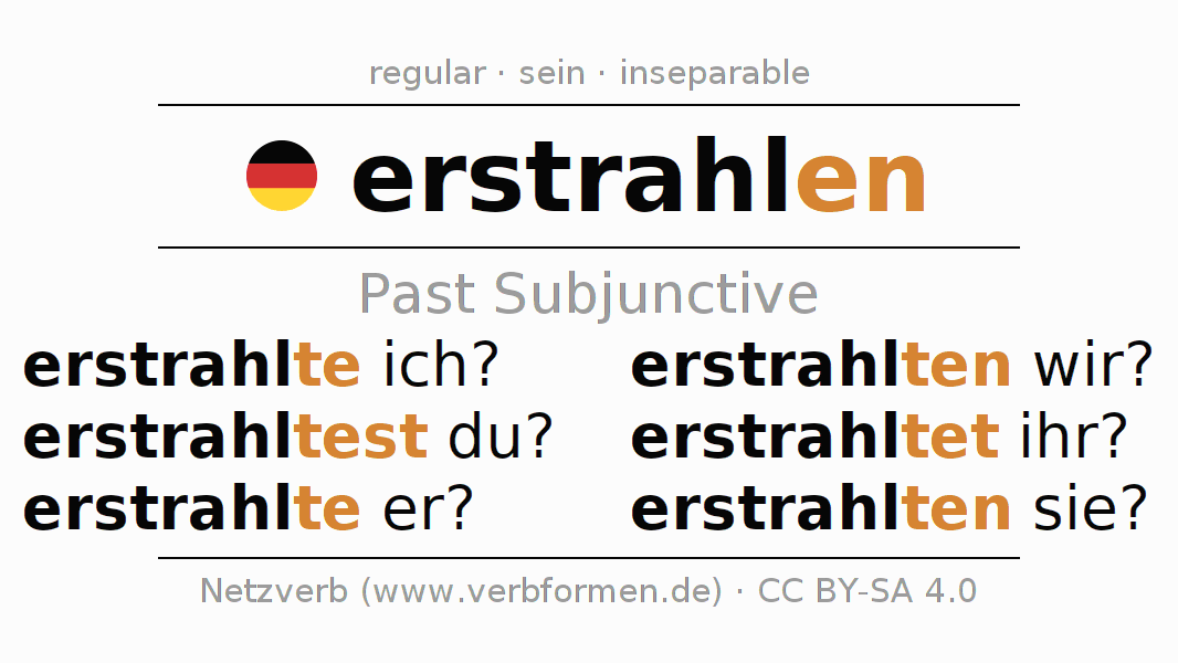 The conjugation of erstrahlen in Subjunctive Imperfect Form of possibility Active is erstrahlte ich?, erstrahltest du?, erstrahlte er?, erstrahlten wir?, erstrahltet ihr?, erstrahlten sie?.The conjugation corresponds to certain grammatical rules. Likewise the requirements for the conjugation of the simple verb forms of erstrahlen in Imperfect Subjunctive. Comments ☆