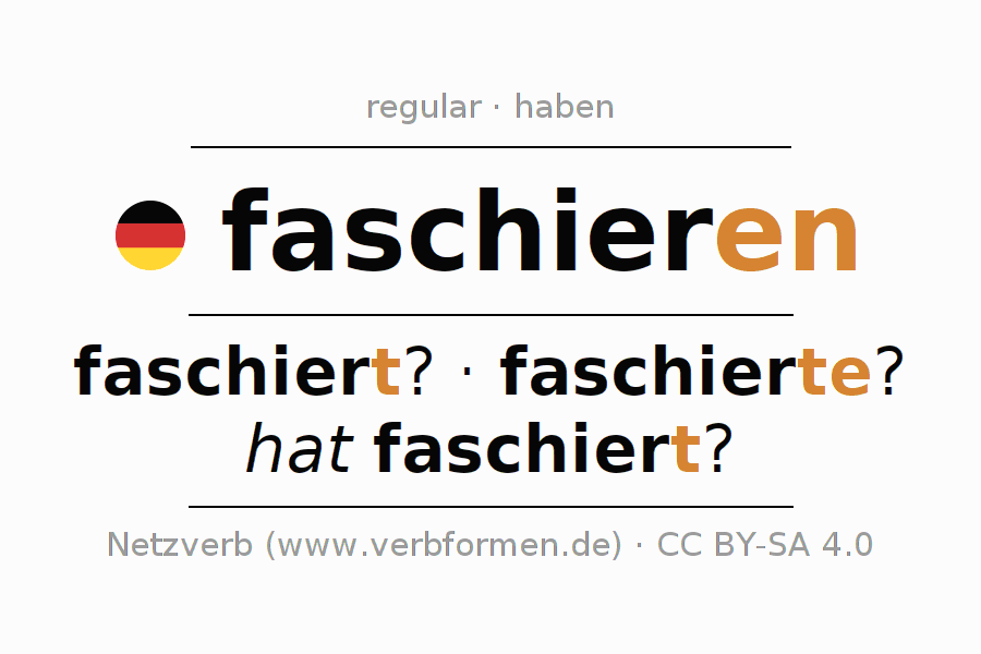 The conjugation of faschieren in Subjunctive Imperfect Form of possibility Active is faschierte ich?, faschiertest du?, faschierte er?, faschierten wir?, faschiertet ihr?, faschierten sie?.The conjugation corresponds to certain grammatical rules. Likewise the requirements for the conjugation of the simple verb forms of faschieren in Imperfect Subjunctive. Comments ☆