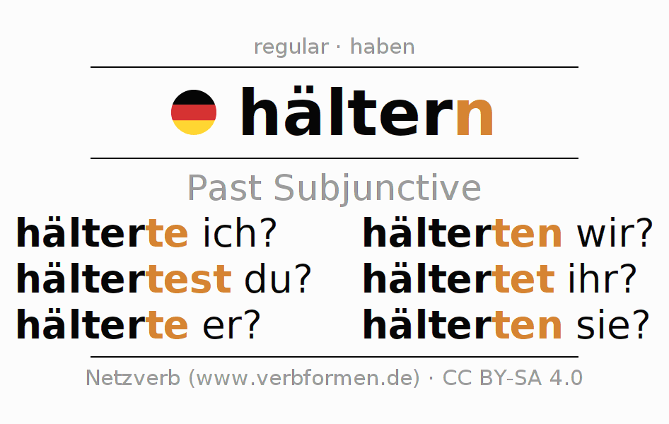 The conjugation of hältern in Subjunctive Imperfect Form of possibility Active is hälterte ich?, hältertest du?, hälterte er?, hälterten wir?, hältertet ihr?, hälterten sie?.The conjugation corresponds to certain grammatical rules. Likewise the requirements for the conjugation of the simple verb forms of hältern in Imperfect Subjunctive. Comments ☆