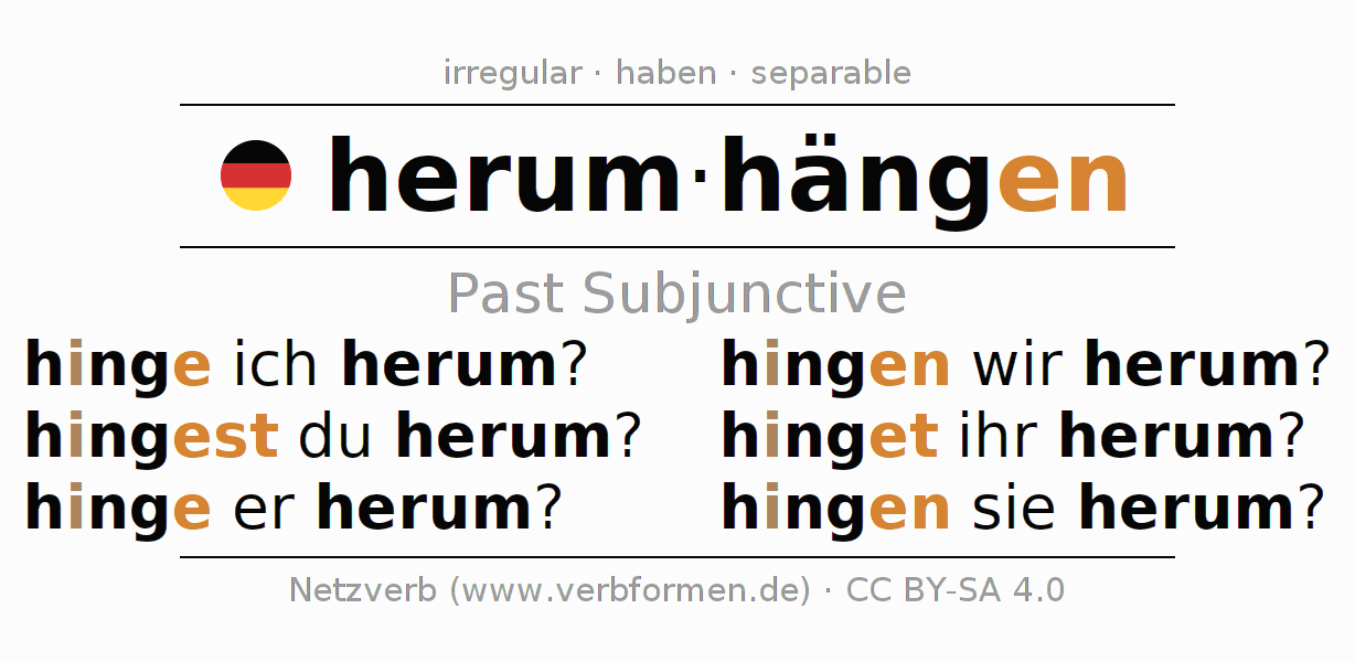 The conjugation of herumhängen in Subjunctive Imperfect Form of possibility Active is hinge ich herum?, hingest du herum?, hinge er herum?, hingen wir herum?, hinget ihr herum?, hingen sie herum?.The conjugation corresponds to certain grammatical rules. Likewise the requirements for the conjugation of the simple verb forms of herumhängen in Imperfect Subjunctive. Comments ☆