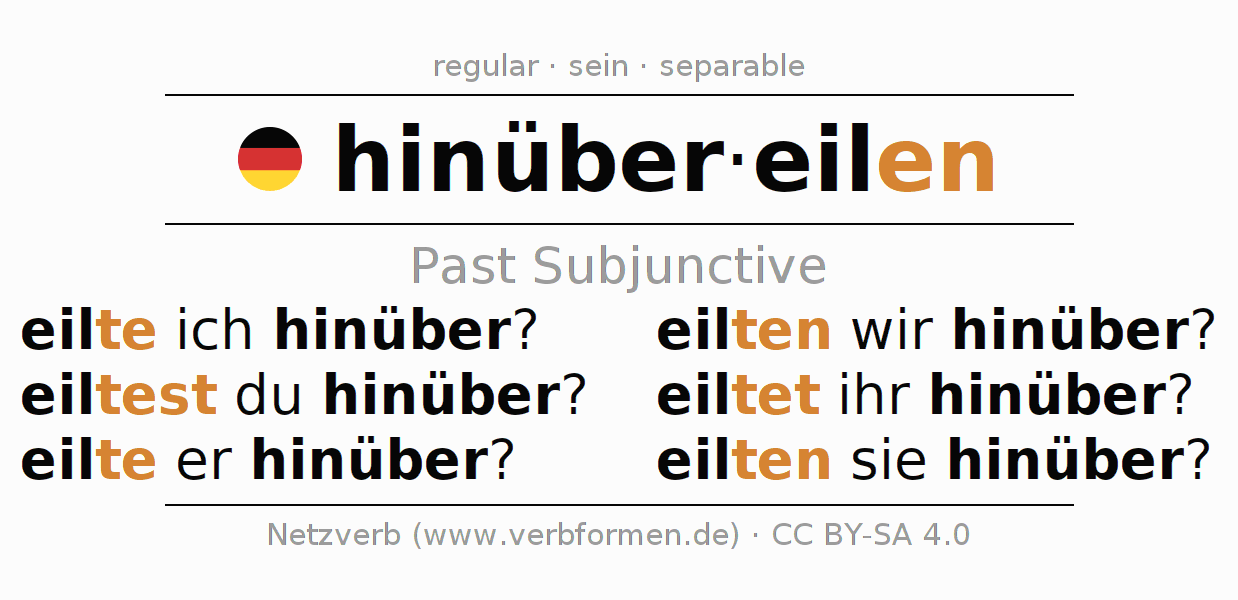 The conjugation of hinübereilen in Subjunctive Imperfect Form of possibility Active is eilte ich hinüber?, eiltest du hinüber?, eilte er hinüber?, eilten wir hinüber?, eiltet ihr hinüber?, eilten sie hinüber?.The conjugation corresponds to certain grammatical rules. Likewise the requirements for the conjugation of the simple verb forms of hinübereilen in Imperfect Subjunctive. Comments ☆