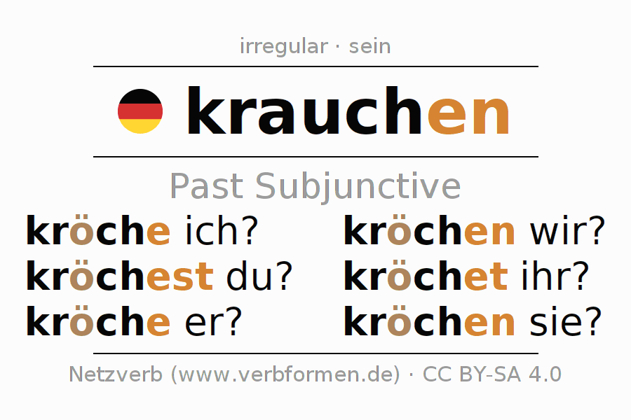 The conjugation of krauchen in Subjunctive Imperfect Form of possibility Active is kröche ich?, kröchest du?, kröche er?, kröchen wir?, kröchet ihr?, kröchen sie?.The conjugation corresponds to certain grammatical rules. Likewise the requirements for the conjugation of the simple verb forms of krauchen in Imperfect Subjunctive. Comments ☆