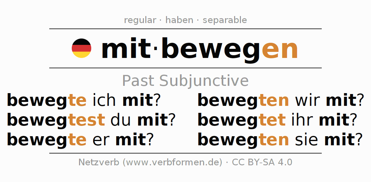 The conjugation of mitbewegen in Subjunctive Imperfect Form of possibility Active is bewegte ich mit?, bewegtest du mit?, bewegte er mit?, bewegten wir mit?, bewegtet ihr mit?, bewegten sie mit?.The conjugation corresponds to certain grammatical rules. Likewise the requirements for the conjugation of the simple verb forms of mitbewegen in Imperfect Subjunctive. Comments ☆