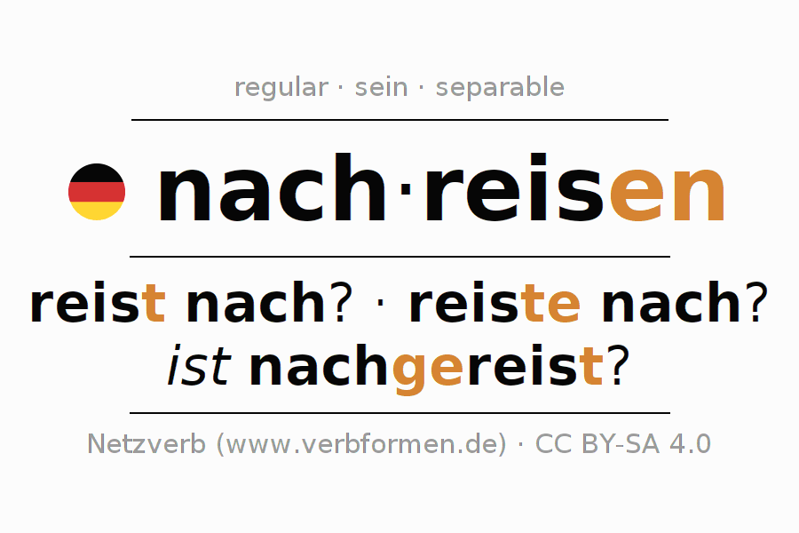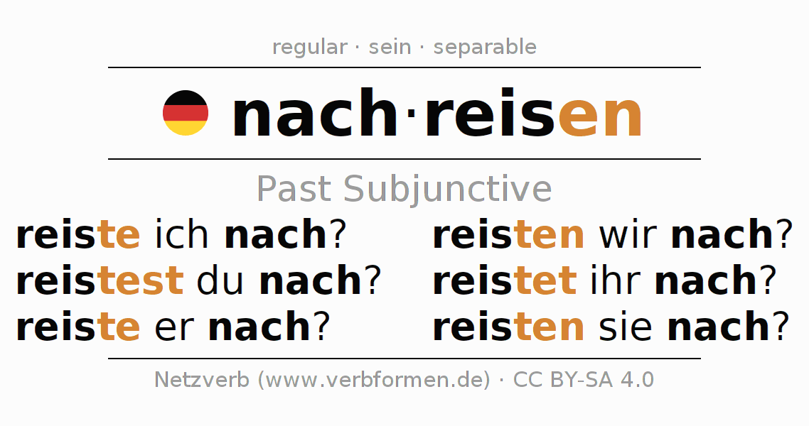 The conjugation of nachreisen in Subjunctive Imperfect Form of possibility Active is reiste ich nach?, reistest du nach?, reiste er nach?, reisten wir nach?, reistet ihr nach?, reisten sie nach?.The conjugation corresponds to certain grammatical rules. Likewise the requirements for the conjugation of the simple verb forms of nachreisen in Imperfect Subjunctive. Comments ☆