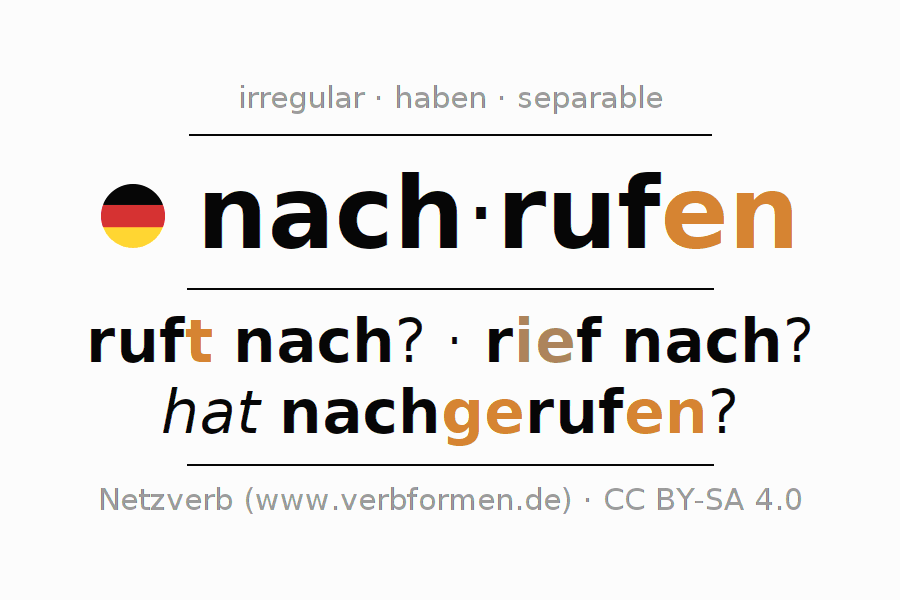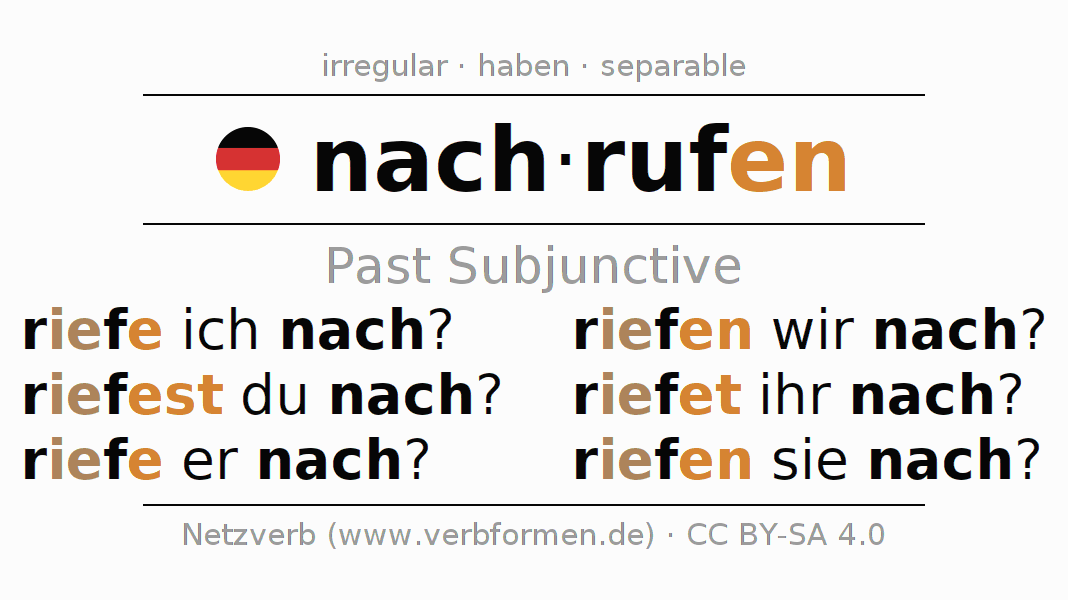 The conjugation of nachrufen in Subjunctive Imperfect Form of possibility Active is riefe ich nach?, riefest du nach?, riefe er nach?, riefen wir nach?, riefet ihr nach?, riefen sie nach?.The conjugation corresponds to certain grammatical rules. Likewise the requirements for the conjugation of the simple verb forms of nachrufen in Imperfect Subjunctive. Comments ☆