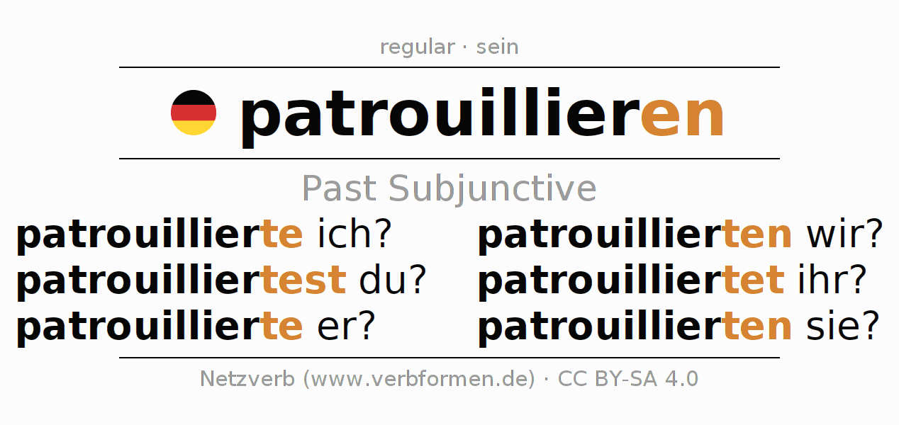 The conjugation of patrouillieren in Subjunctive Imperfect Form of possibility Active is patrouillierte ich?, patrouilliertest du?, patrouillierte er?, patrouillierten wir?, patrouilliertet ihr?, patrouillierten sie?.The conjugation corresponds to certain grammatical rules. Likewise the requirements for the conjugation of the simple verb forms of patrouillieren in Imperfect Subjunctive. Comments ☆