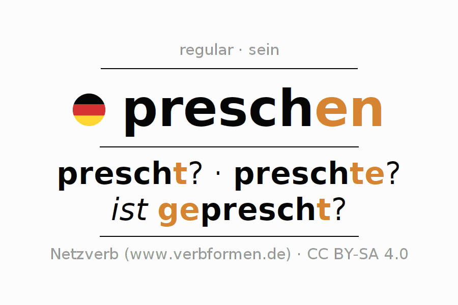 The conjugation of preschen in Subjunctive Imperfect Form of possibility Active is preschte ich?, preschtest du?, preschte er?, preschten wir?, preschtet ihr?, preschten sie?.The conjugation corresponds to certain grammatical rules. Likewise the requirements for the conjugation of the simple verb forms of preschen in Imperfect Subjunctive. Comments ☆