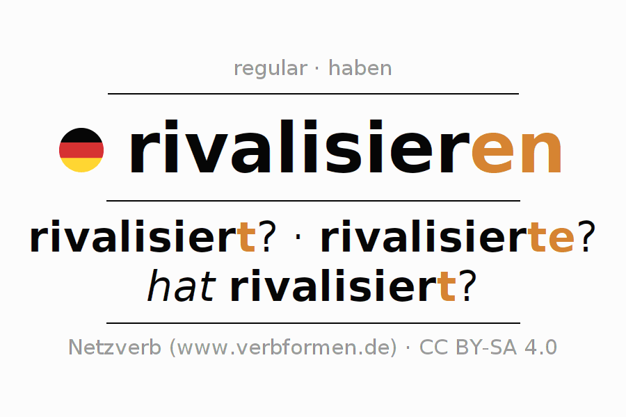 The conjugation of rivalisieren in Subjunctive Imperfect Form of possibility Active is rivalisierte ich?, rivalisiertest du?, rivalisierte er?, rivalisierten wir?, rivalisiertet ihr?, rivalisierten sie?.The conjugation corresponds to certain grammatical rules. Likewise the requirements for the conjugation of the simple verb forms of rivalisieren in Imperfect Subjunctive. Comments ☆