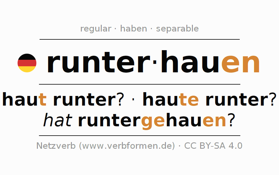 The conjugation of runterhauen in Subjunctive Imperfect Form of possibility Active is haute ich runter?, hautest du runter?, haute er runter?, hauten wir runter?, hautet ihr runter?, hauten sie runter?.The conjugation corresponds to certain grammatical rules. Likewise the requirements for the conjugation of the simple verb forms of runterhauen in Imperfect Subjunctive. Comments ☆