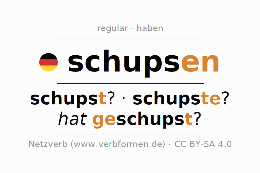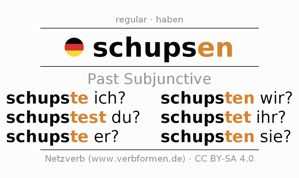 The conjugation of schupsen in Subjunctive Imperfect Form of possibility Active is schupste ich?, schupstest du?, schupste er?, schupsten wir?, schupstet ihr?, schupsten sie?.The conjugation corresponds to certain grammatical rules. Likewise the requirements for the conjugation of the simple verb forms of schupsen in Imperfect Subjunctive. Comments ☆
