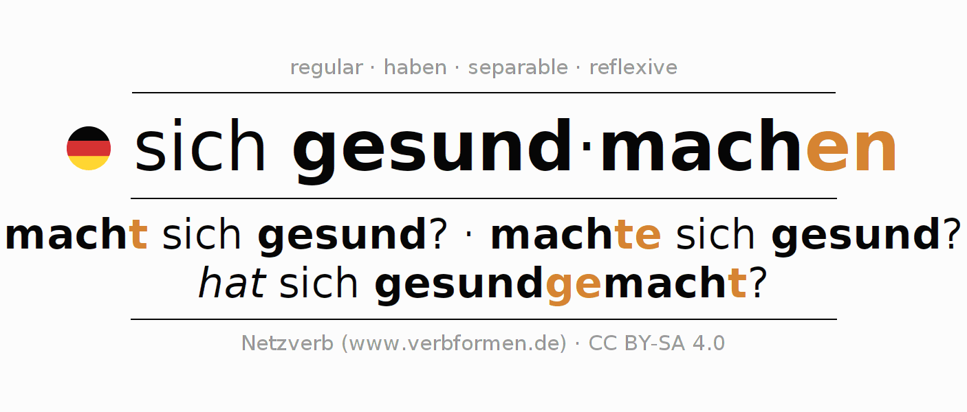 The conjugation of sich gesundmachen in Subjunctive Imperfect Form of possibility Active is machte ich mir/mich gesund?, machtest du dir/dich gesund?, machte er sich gesund?, machten wir uns gesund?, machtet ihr euch gesund?, machten sie sich gesund?.The conjugation corresponds to certain grammatical rules. Likewise the requirements for the conjugation of the simple verb forms of gesundmachen in Imperfect Subjunctive. Comments ☆