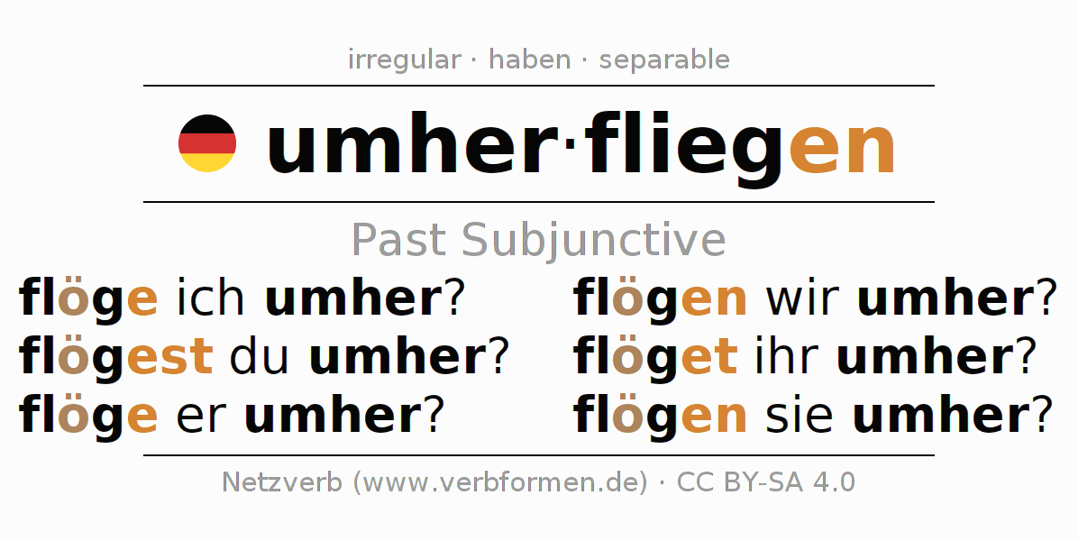 The verb umherfliegen (hat) fully conjugated in all persons and numbers in the Subjunctive Imperfect