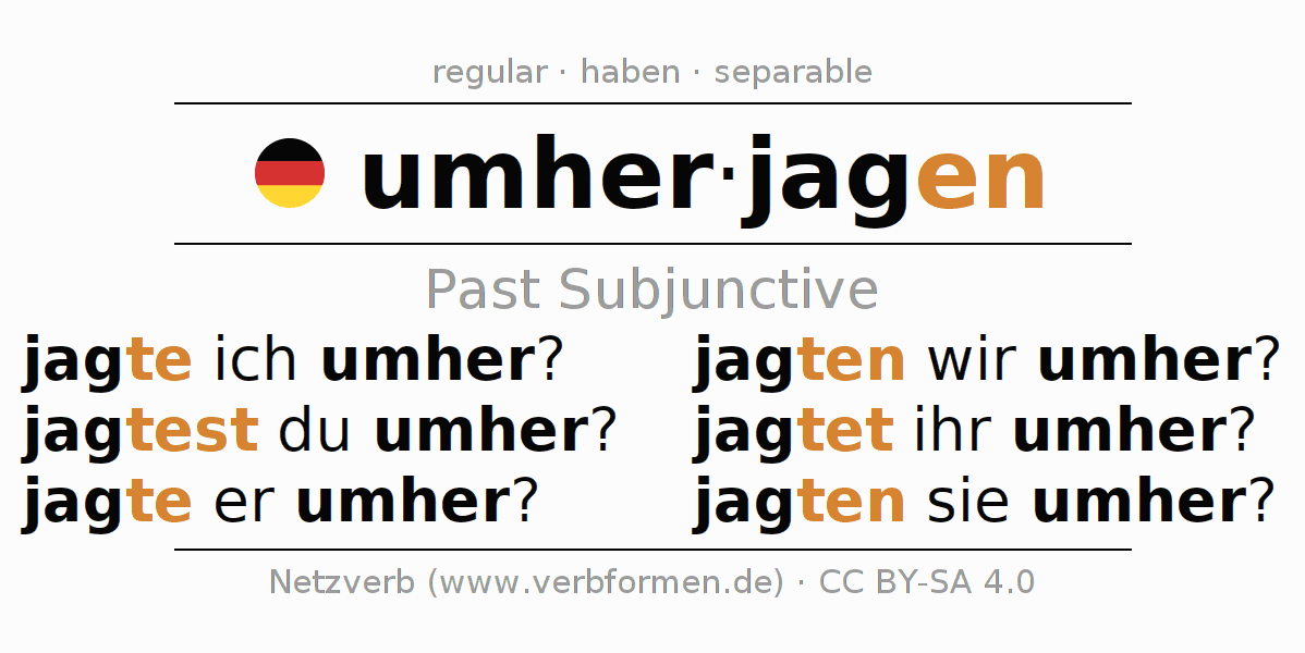 The conjugation of umherjagen in Subjunctive Imperfect Form of possibility Active is jagte ich umher?, jagtest du umher?, jagte er umher?, jagten wir umher?, jagtet ihr umher?, jagten sie umher?.The conjugation corresponds to certain grammatical rules. Likewise the requirements for the conjugation of the simple verb forms of umherjagen in Imperfect Subjunctive. Comments ☆