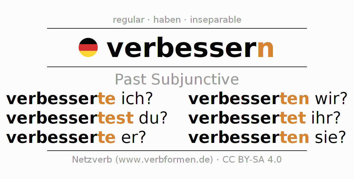 The conjugation of verbessern in Subjunctive Imperfect Form of possibility Active is verbesserte ich?, verbessertest du?, verbesserte er?, verbesserten wir?, verbessertet ihr?, verbesserten sie?.The conjugation corresponds to certain grammatical rules. Likewise the requirements for the conjugation of the simple verb forms of verbessern in Imperfect Subjunctive. Comments ☆