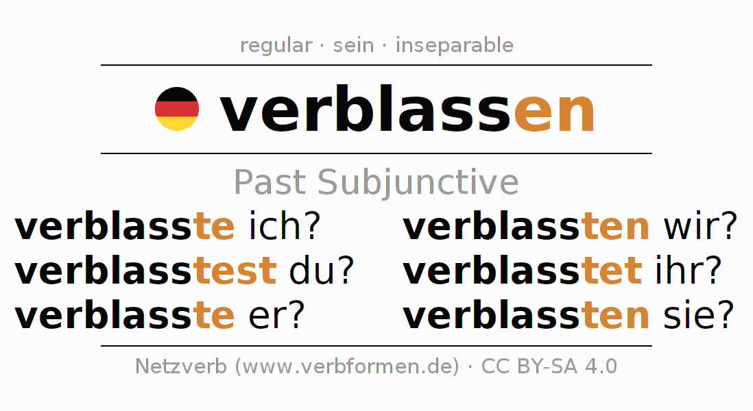 The conjugation of verblassen in Subjunctive Imperfect Form of possibility Active is verblasste ich?, verblasstest du?, verblasste er?, verblassten wir?, verblasstet ihr?, verblassten sie?.The conjugation corresponds to certain grammatical rules. Likewise the requirements for the conjugation of the simple verb forms of verblassen in Imperfect Subjunctive. Comments ☆