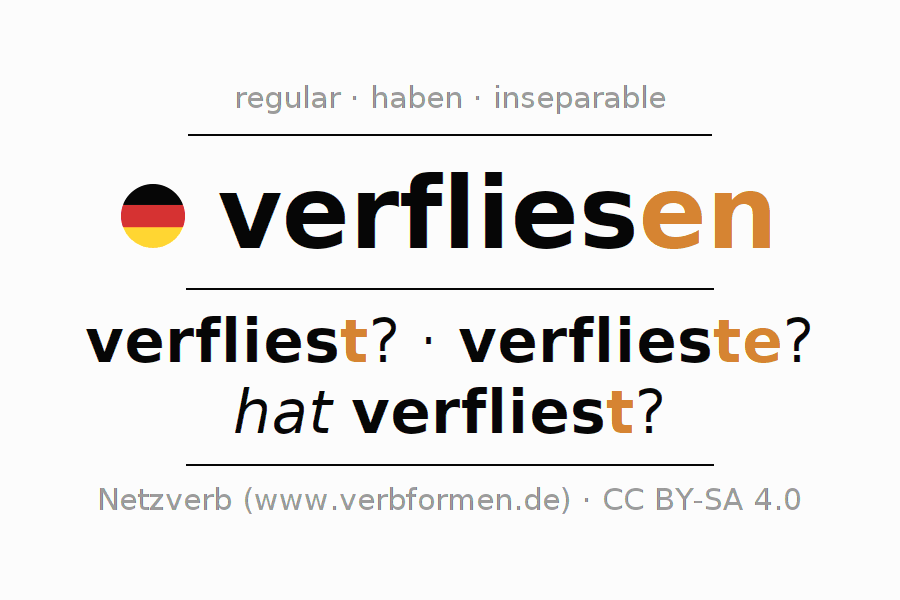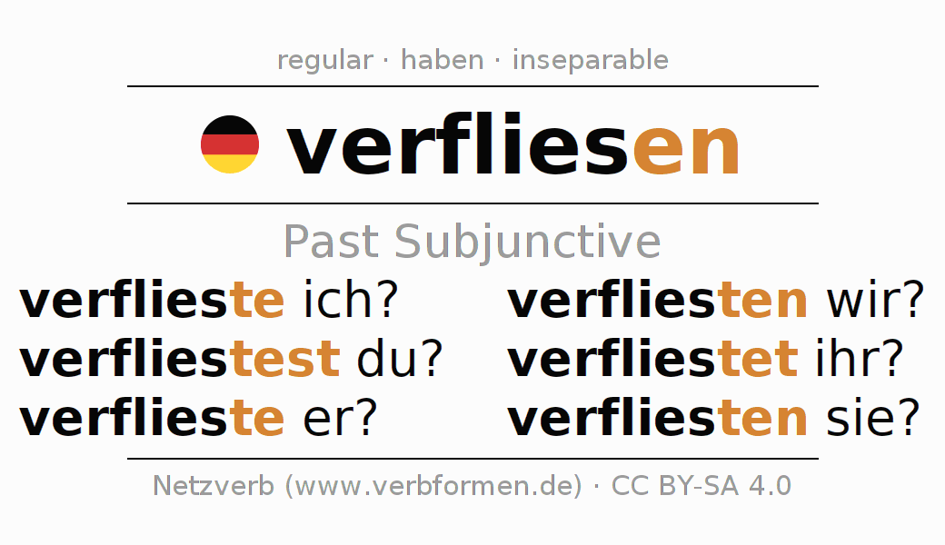 The conjugation of verfliesen in Subjunctive Imperfect Form of possibility Active is verflieste ich?, verfliestest du?, verflieste er?, verfliesten wir?, verfliestet ihr?, verfliesten sie?.The conjugation corresponds to certain grammatical rules. Likewise the requirements for the conjugation of the simple verb forms of verfliesen in Imperfect Subjunctive. Comments ☆