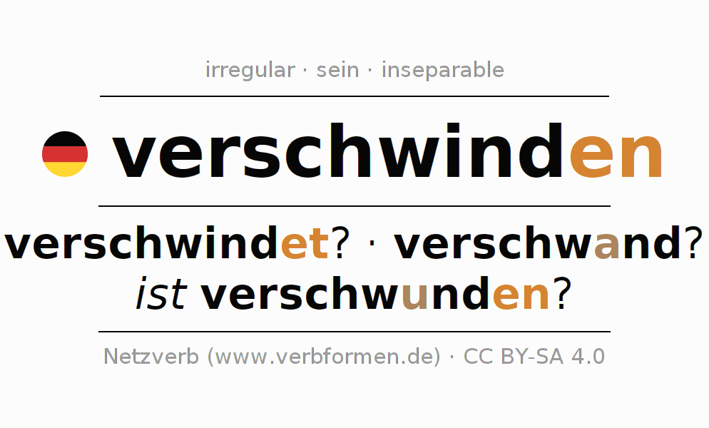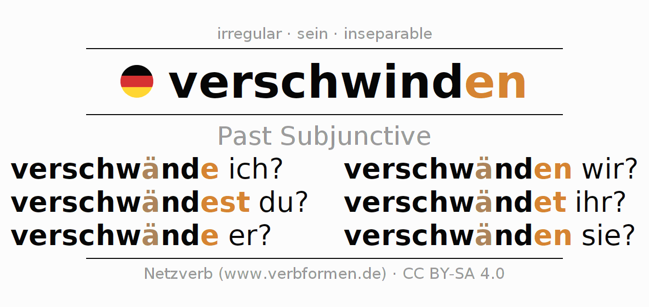 The conjugation of verschwinden in Subjunctive Imperfect Form of possibility Active is verschwände ich?, verschwändest du?, verschwände er?, verschwänden wir?, verschwändet ihr?, verschwänden sie?.The conjugation corresponds to certain grammatical rules. Likewise the requirements for the conjugation of the simple verb forms of verschwinden in Imperfect Subjunctive. Comments ☆