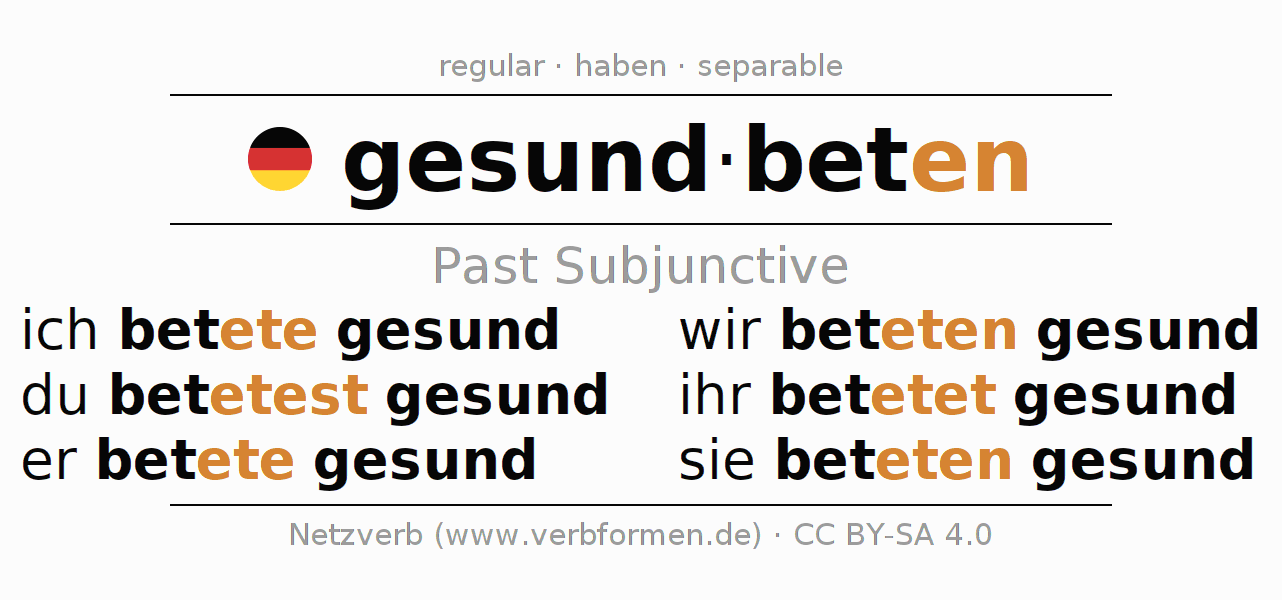 The conjugation of gesundbeten (healing through prayer, prayer healing) in subjunctive II is: ich betete gesund, du betetest gesund, er betete gesund, wir beteten gesund, ihr betetet gesund, sie beteten gesund. As a regular verb the unmodified stem bet is used. The subjunctive endings -ete, -etest, -ete, -eten, -etet, -eten are appended to this stem. The endings are extended by "e", as the stem ends on -t. The prefix gesund- of gesundbeten is separated. The conjugation of these forms conforms to the grammatical rules for verbs in the subjunctive II tense.