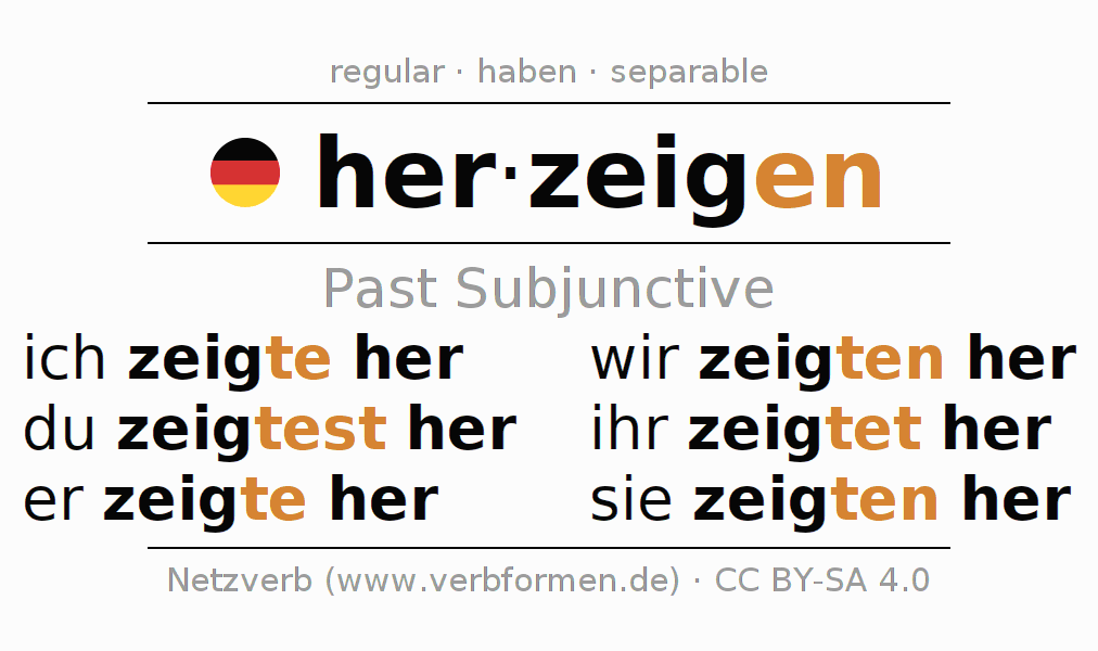 The conjugation of herzeigen (show, indicate) in subjunctive II is: ich zeigte her, du zeigtest her, er zeigte her, wir zeigten her, ihr zeigtet her, sie zeigten her. As a regular verb the unmodified stem zeig is used. The subjunctive endings -te, -test, -te, -ten, -tet, -ten are appended to this stem. The prefix her- of herzeigen is separated. The conjugation of these forms conforms to the grammatical rules for verbs in the subjunctive II tense.