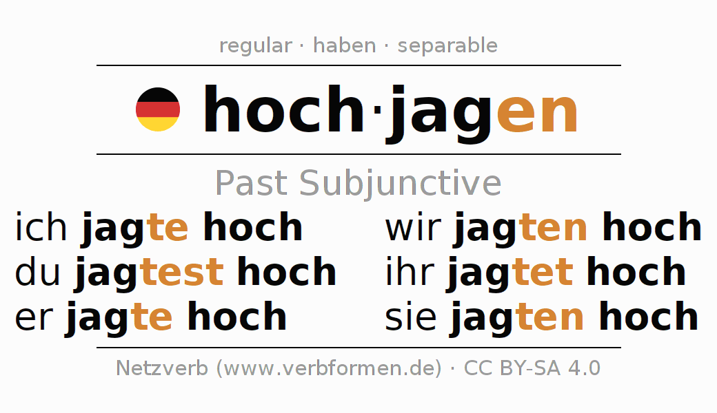 The conjugation of hochjagen (accelerate, blow up) in subjunctive II is: ich jagte hoch, du jagtest hoch, er jagte hoch, wir jagten hoch, ihr jagtet hoch, sie jagten hoch. As a regular verb the unmodified stem jag is used. The subjunctive endings -te, -test, -te, -ten, -tet, -ten are appended to this stem. The prefix hoch- of hochjagen is separated. The conjugation of these forms conforms to the grammatical rules for verbs in the subjunctive II tense.