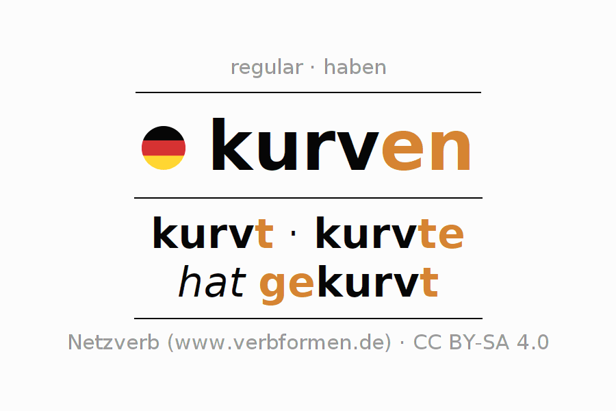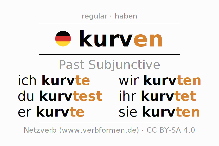 The conjugation of kurven (bend, curve) in subjunctive II is: ich kurvte, du kurvtest, er kurvte, wir kurvten, ihr kurvtet, sie kurvten. As a regular verb the unmodified stem kurv is used. The subjunctive endings -te, -test, -te, -ten, -tet, -ten are appended to this stem. The conjugation of these forms conforms to the grammatical rules for verbs in the subjunctive II tense.