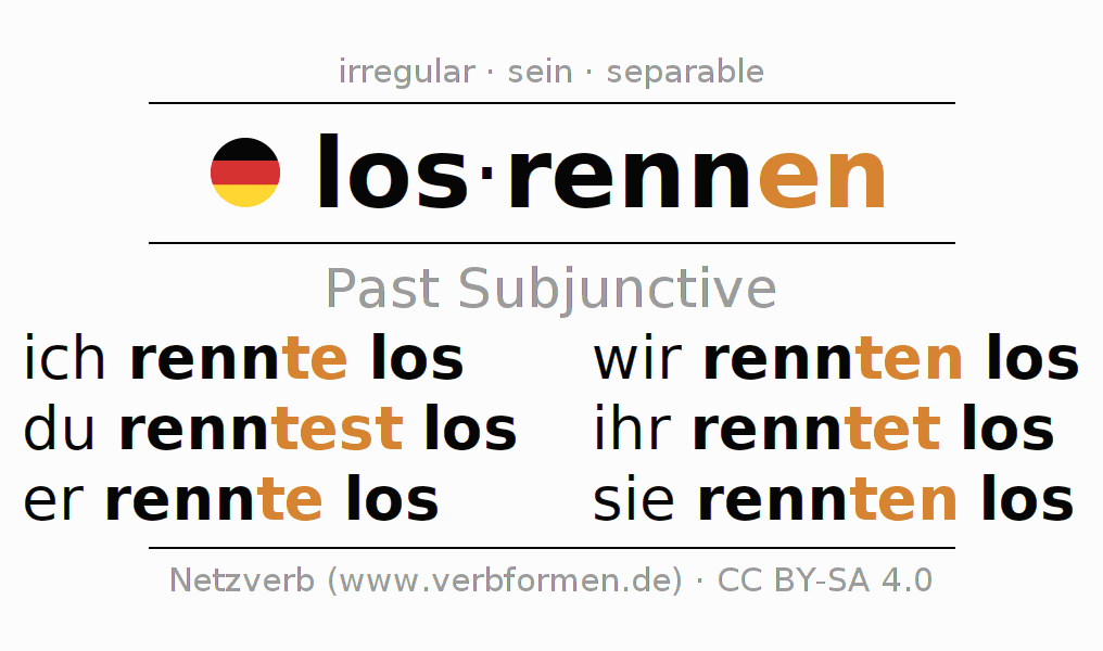 The conjugation of losrennen (run off, dash) in subjunctive II is: ich rennte los, du renntest los, er rennte los, wir rennten los, ihr renntet los, sie rennten los. As an irregular verb is the changed subjunctive stem renn- used. The subjunctive endings -te, -test, -te, -ten, -tet, -ten are appended to this stem. The prefix los- of losrennen is separated. The conjugation of these forms conforms to the grammatical rules for verbs in the subjunctive II tense.