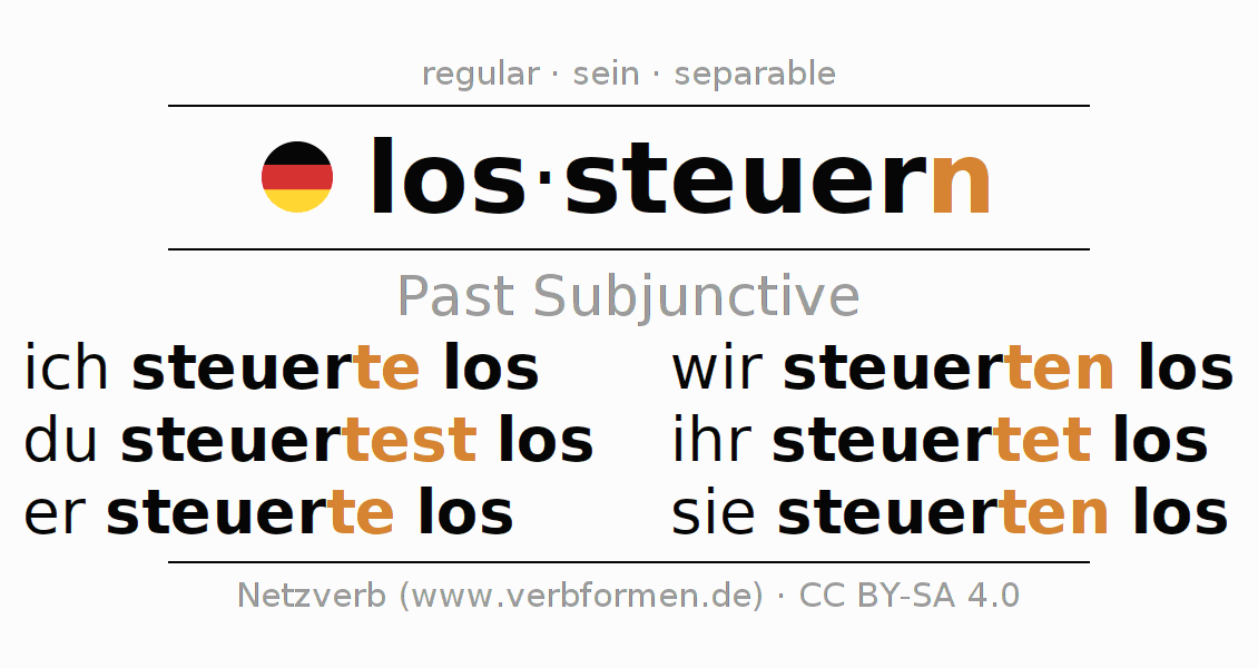 The conjugation of lossteuern (head for, navigate) in subjunctive II is: ich steuerte los, du steuertest los, er steuerte los, wir steuerten los, ihr steuertet los, sie steuerten los. As a regular verb the unmodified stem steuer is used. The subjunctive endings -te, -test, -te, -ten, -tet, -ten are appended to this stem. The prefix los- of lossteuern is separated. The conjugation of these forms conforms to the grammatical rules for verbs in the subjunctive II tense.