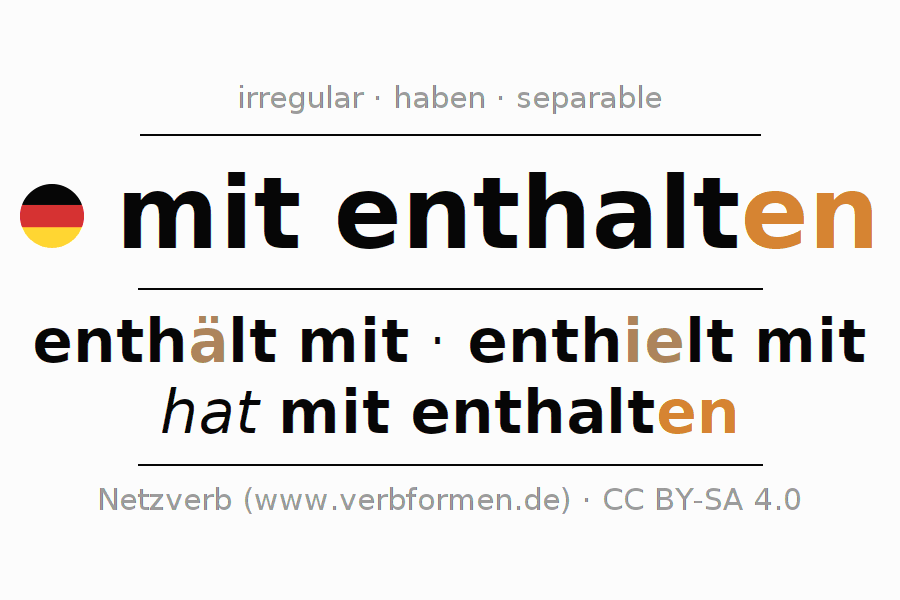 The conjugation of mitenthalten (also be included, be included) in subjunctive II is: ich enthielte mit, du enthieltest mit, er enthielte mit, wir enthielten mit, ihr enthieltet mit, sie enthielten mit. As an irregular, strong verb with ablaut -ie- the subjunctive stem -hielt- is used. The subjunctive endings -e, -est, -e, -en, -et, -en are appended to this stem. The prefix mit - of mitenthalten is separated. The conjugation of these forms conforms to the grammatical rules for verbs in the subjunctive II tense.