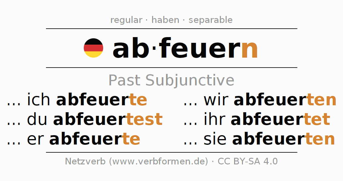 The conjugation of abfeuern in Subjunctive Imperfect Form of possibility Active is ... ich abfeuerte, ... du abfeuertest, ... er abfeuerte, ... wir abfeuerten, ... ihr abfeuertet, ... sie abfeuerten.The conjugation corresponds to certain grammatical rules. Likewise the requirements for the conjugation of the simple verb forms of abfeuern in Imperfect Subjunctive. Comments ☆