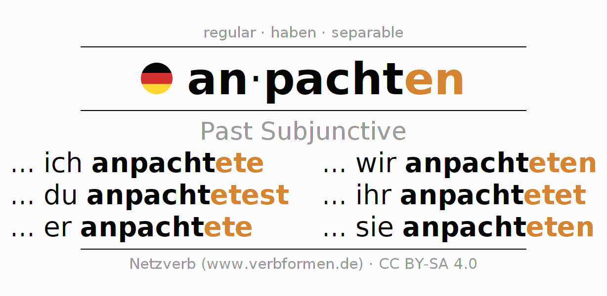 The conjugation of anpachten in Subjunctive Imperfect Form of possibility Active is ... ich anpachtete, ... du anpachtetest, ... er anpachtete, ... wir anpachteten, ... ihr anpachtetet, ... sie anpachteten.The conjugation corresponds to certain grammatical rules. Likewise the requirements for the conjugation of the simple verb forms of anpachten in Imperfect Subjunctive. Comments ☆