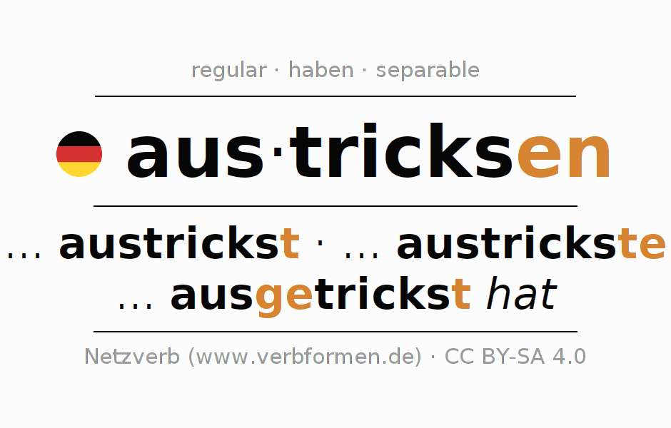 The conjugation of austricksen in Subjunctive Imperfect Form of possibility Active is ... ich austrickste, ... du austrickstest, ... er austrickste, ... wir austricksten, ... ihr austrickstet, ... sie austricksten.The conjugation corresponds to certain grammatical rules. Likewise the requirements for the conjugation of the simple verb forms of austricksen in Imperfect Subjunctive. Comments ☆