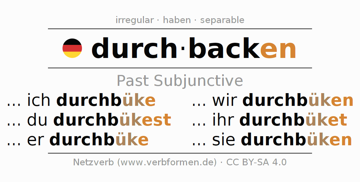 The conjugation of durchbacken in Subjunctive Imperfect Form of possibility Active is ... ich durchbüke, ... du durchbükest, ... er durchbüke, ... wir durchbüken, ... ihr durchbüket, ... sie durchbüken.The conjugation corresponds to certain grammatical rules. Likewise the requirements for the conjugation of the simple verb forms of durchbacken in Imperfect Subjunctive. Comments ☆