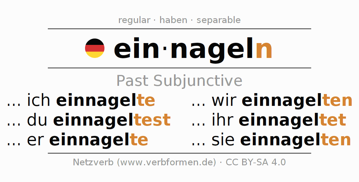 The conjugation of einnageln in Subjunctive Imperfect Form of possibility Active is ... ich einnagelte, ... du einnageltest, ... er einnagelte, ... wir einnagelten, ... ihr einnageltet, ... sie einnagelten.The conjugation corresponds to certain grammatical rules. Likewise the requirements for the conjugation of the simple verb forms of einnageln in Imperfect Subjunctive. Comments ☆