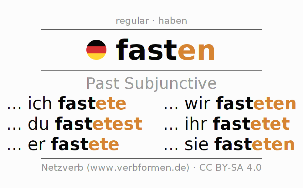 The conjugation of fasten in Subjunctive Imperfect Form of possibility Active is ... ich fastete, ... du fastetest, ... er fastete, ... wir fasteten, ... ihr fastetet, ... sie fasteten.The conjugation corresponds to certain grammatical rules. Likewise the requirements for the conjugation of the simple verb forms of fasten in Imperfect Subjunctive. Comments ☆