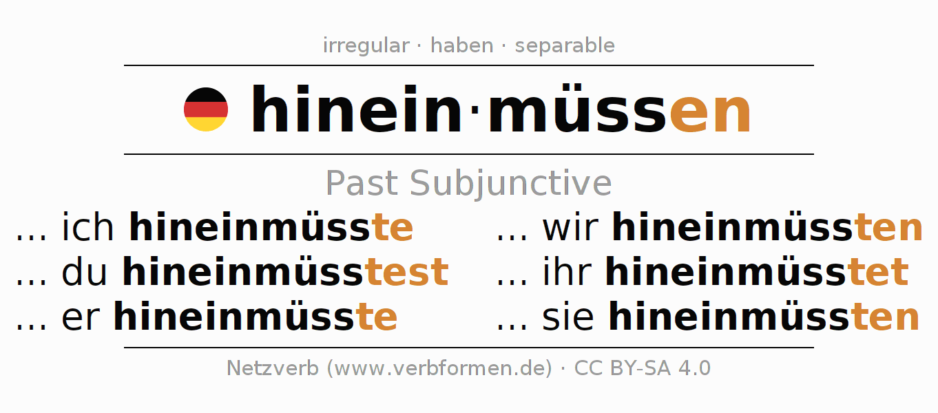 The verb hineinmüssen fully conjugated in all persons and numbers in the Subjunctive Imperfect
