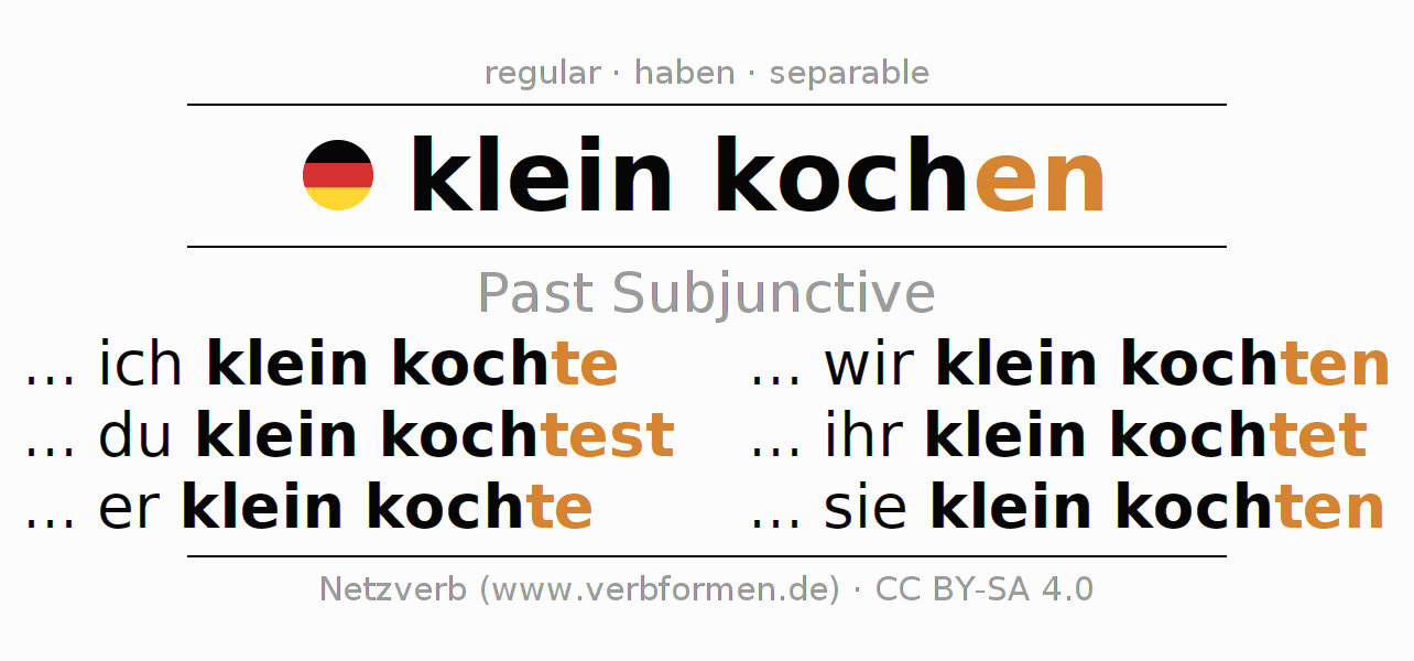 The conjugation of kleinkochen in Subjunctive Imperfect Form of possibility Active is ... ich klein kochte, ... du klein kochtest, ... er klein kochte, ... wir klein kochten, ... ihr klein kochtet, ... sie klein kochten.The conjugation corresponds to certain grammatical rules. Likewise the requirements for the conjugation of the simple verb forms of kleinkochen in Imperfect Subjunctive. Comments ☆
