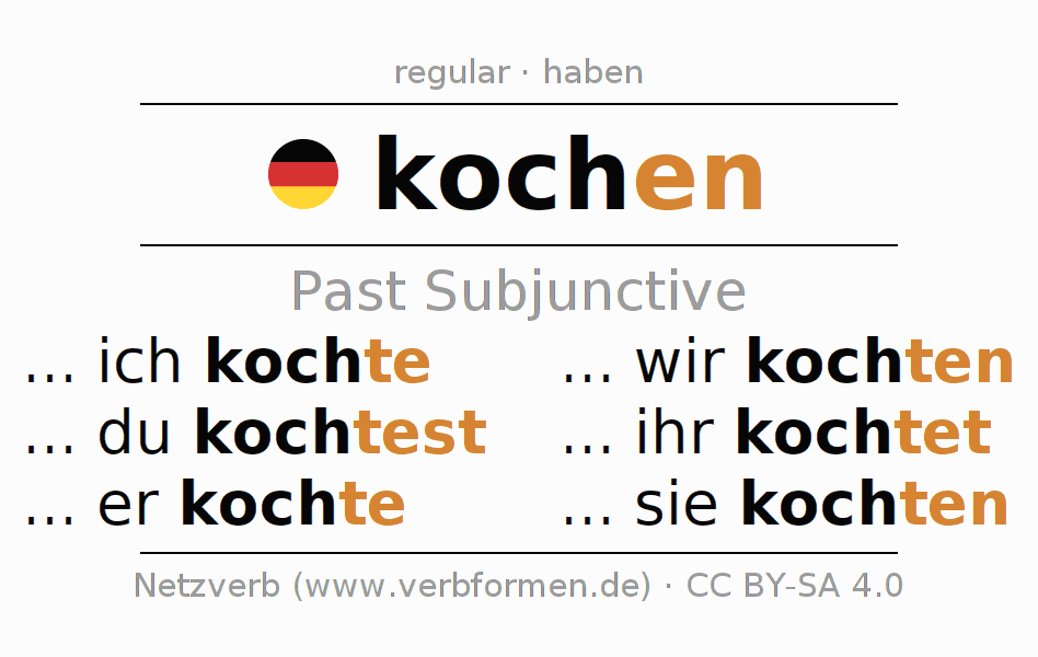 The conjugation of kochen in Subjunctive Imperfect Form of possibility Active is ... ich kochte, ... du kochtest, ... er kochte, ... wir kochten, ... ihr kochtet, ... sie kochten.The conjugation corresponds to certain grammatical rules. Likewise the requirements for the conjugation of the simple verb forms of kochen in Imperfect Subjunctive. 2Comments ☆