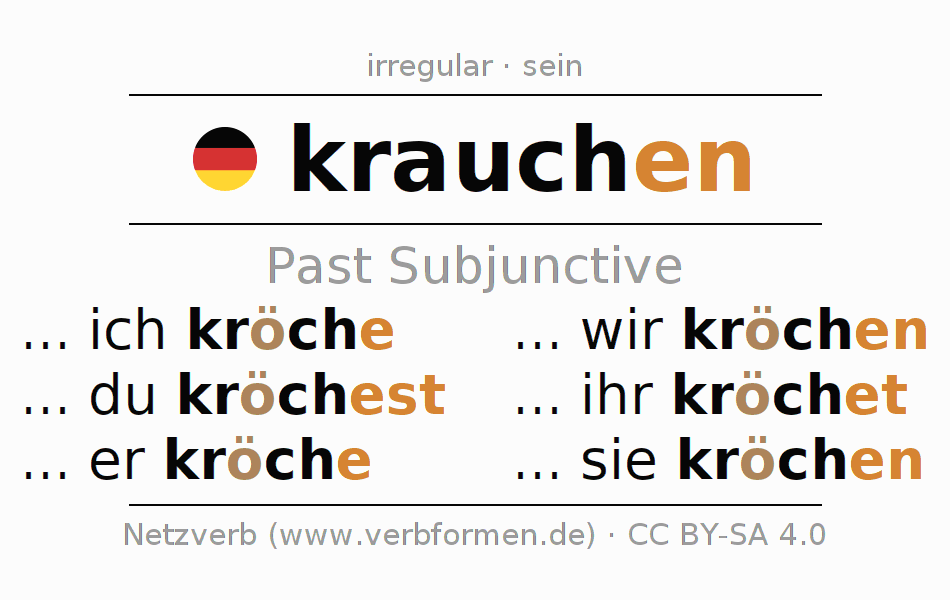 The conjugation of krauchen in Subjunctive Imperfect Form of possibility Active is ... ich kröche, ... du kröchest, ... er kröche, ... wir kröchen, ... ihr kröchet, ... sie kröchen.The conjugation corresponds to certain grammatical rules. Likewise the requirements for the conjugation of the simple verb forms of krauchen in Imperfect Subjunctive. Comments ☆