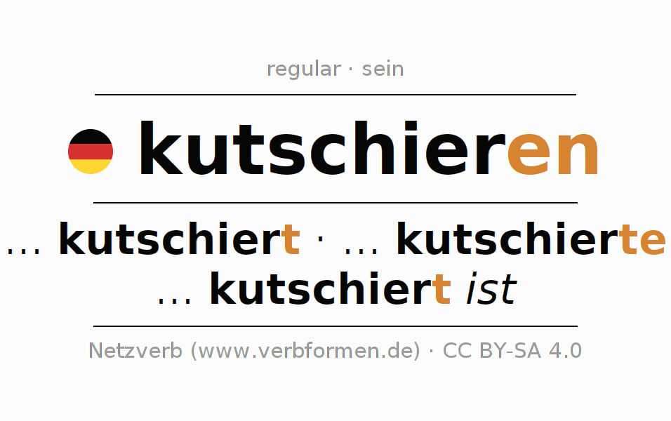 The conjugation of kutschieren in Subjunctive Imperfect Form of possibility Active is ... ich kutschierte, ... du kutschiertest, ... er kutschierte, ... wir kutschierten, ... ihr kutschiertet, ... sie kutschierten.The conjugation corresponds to certain grammatical rules. Likewise the requirements for the conjugation of the simple verb forms of kutschieren in Imperfect Subjunctive. Comments ☆