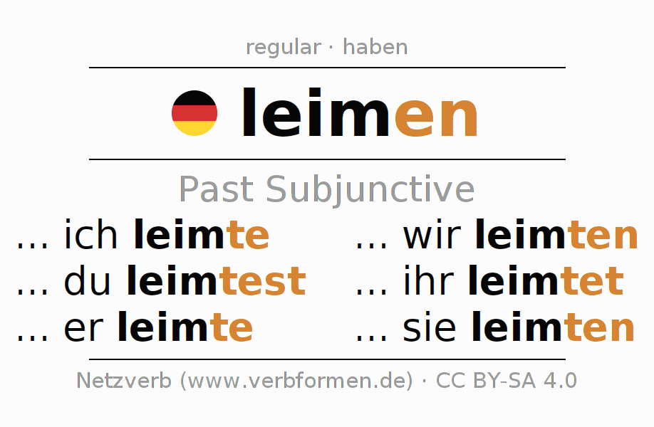 The conjugation of leimen in Subjunctive Imperfect Form of possibility Active is ... ich leimte, ... du leimtest, ... er leimte, ... wir leimten, ... ihr leimtet, ... sie leimten.The conjugation corresponds to certain grammatical rules. Likewise the requirements for the conjugation of the simple verb forms of leimen in Imperfect Subjunctive. Comments ☆