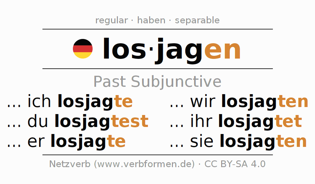 The conjugation of losjagen in Subjunctive Imperfect Form of possibility Active is ... ich losjagte, ... du losjagtest, ... er losjagte, ... wir losjagten, ... ihr losjagtet, ... sie losjagten.The conjugation corresponds to certain grammatical rules. Likewise the requirements for the conjugation of the simple verb forms of losjagen in Imperfect Subjunctive. Comments ☆