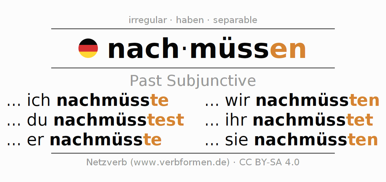 The conjugation of nachmüssen in Subjunctive Imperfect Form of possibility Active is ... ich nachmüsste, ... du nachmüsstest, ... er nachmüsste, ... wir nachmüssten, ... ihr nachmüsstet, ... sie nachmüssten.The conjugation corresponds to certain grammatical rules. Likewise the requirements for the conjugation of the simple verb forms of nachmüssen in Imperfect Subjunctive. Comments ☆