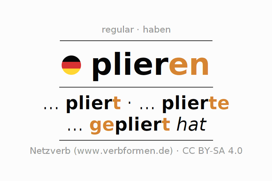 The conjugation of plieren in Subjunctive Imperfect Form of possibility Active is ... ich plierte, ... du pliertest, ... er plierte, ... wir plierten, ... ihr pliertet, ... sie plierten.The conjugation corresponds to certain grammatical rules. Likewise the requirements for the conjugation of the simple verb forms of plieren in Imperfect Subjunctive. Comments ☆