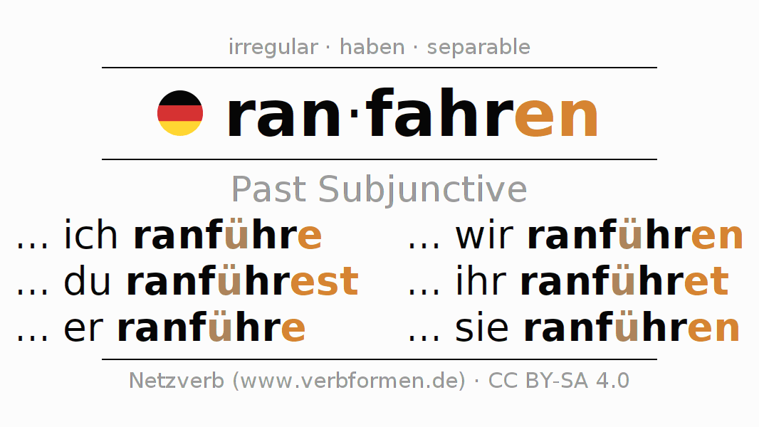 The verb ranfahren (hat) fully conjugated in all persons and numbers in the Subjunctive Imperfect