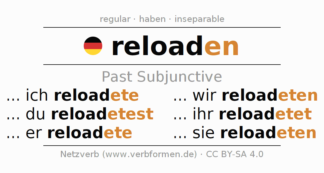 The conjugation of reloaden in Subjunctive Imperfect Form of possibility Active is ... ich reloadete, ... du reloadetest, ... er reloadete, ... wir reloadeten, ... ihr reloadetet, ... sie reloadeten.The conjugation corresponds to certain grammatical rules. Likewise the requirements for the conjugation of the simple verb forms of reloaden in Imperfect Subjunctive. Comments ☆