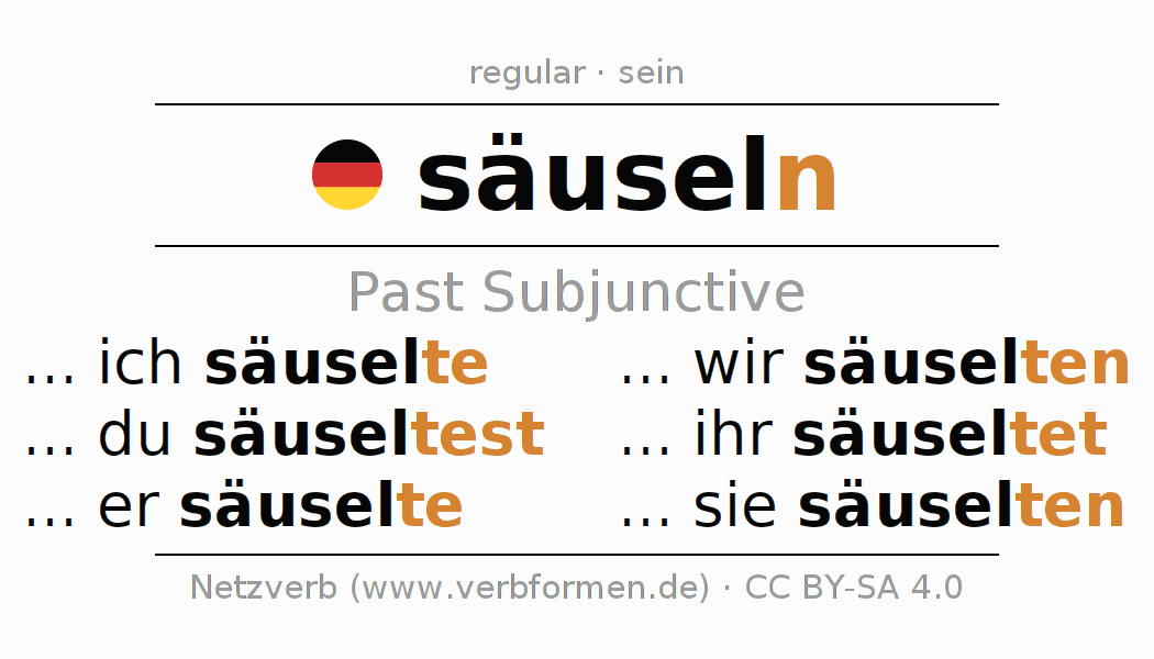 The conjugation of säuseln in Subjunctive Imperfect Form of possibility Active is ... ich säuselte, ... du säuseltest, ... er säuselte, ... wir säuselten, ... ihr säuseltet, ... sie säuselten.The conjugation corresponds to certain grammatical rules. Likewise the requirements for the conjugation of the simple verb forms of säuseln in Imperfect Subjunctive. Comments ☆
